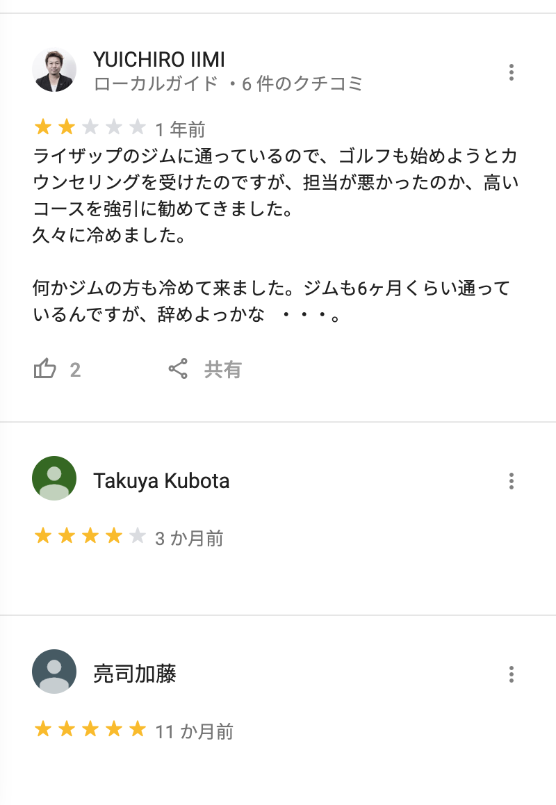 ライザップゴルフ公式で公開されている実際に通った方の口コミを紹介します。創作の口コミではなく、本当に入会した方の口コミですので、参考になるかと思います。